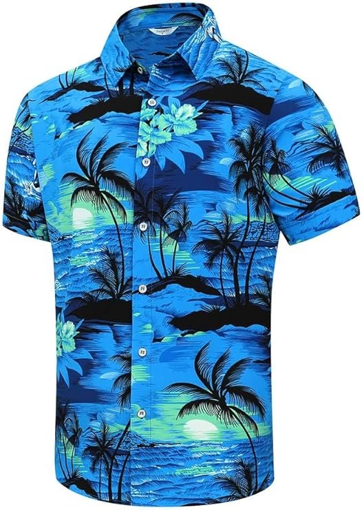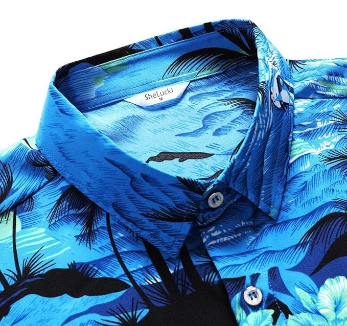 This stylish Hawaiian shirt features a bold blue tropical print with palm trees, ocean waves, and sunset details that give it a fresh island vibe. Made from soft, breathable fabric, it ensures comfort even in hot weather. The classic collar and button-up style make it ideal for vacations, beach parties, summer events, or relaxed everyday wear. Its eye-catching design adds fun, color, and personality to your wardrobe.